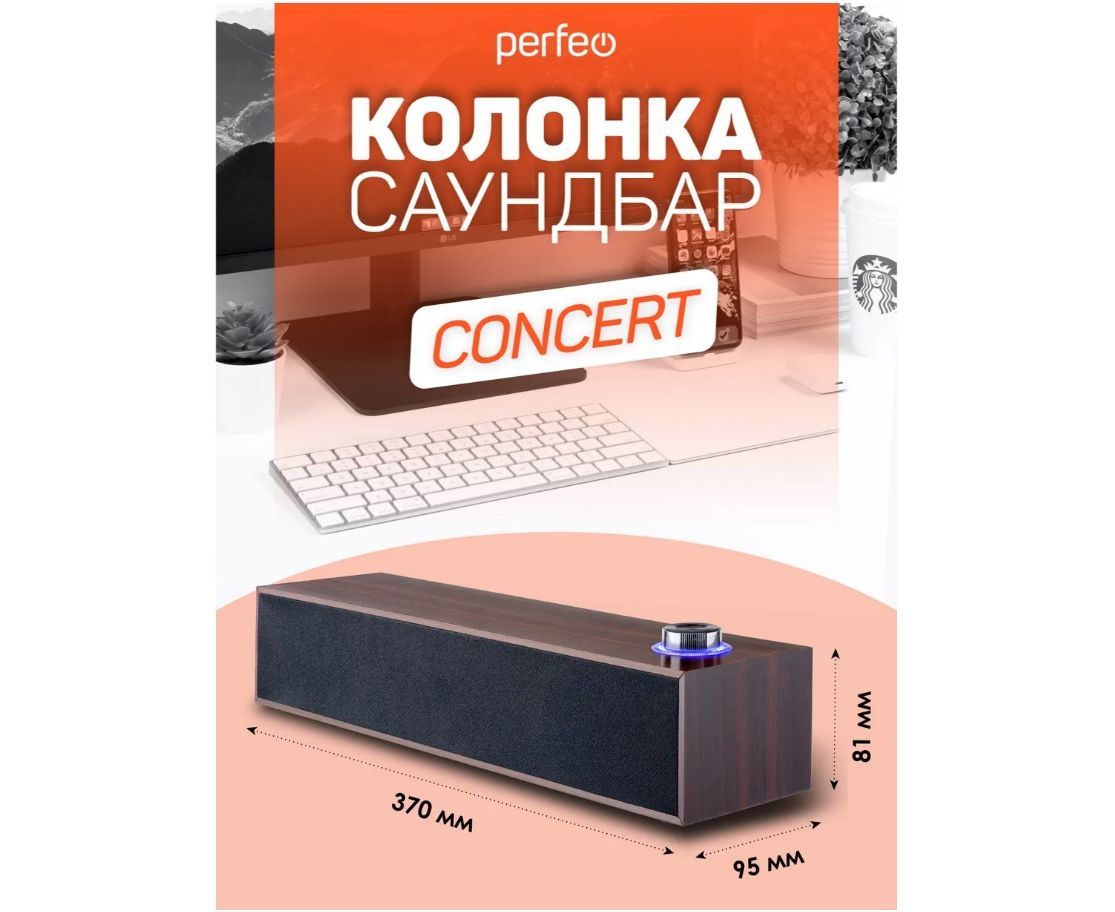 Колонка-саундбар "CONCERT" - идеально подойдёт для тех, кто работает за компьютером или ноутбуком, увлекается компьютерными играми, любит отвлечься на любимую музыку, аудиокниги, подкасты или хорошие фильмы. Подключение саундбара " CONCERT " к источникам звука осуществляется с помощью аудиокабеля с штекером Jack 3,5 мм. Питание саундбар получает через USB кабель, посредством подключения к электросети через сетевой адаптер (в комплект не входит), либо саундбар можно подключить к Power Bank'у. Саундбар "CONCERT" подарит вам яркий и насыщенный звук благодаря выходной мощности 6 Вт, а с помощью регулятора с подсветкой на верхней панели корпуса колонки очень удобно регулировать громкость звука! Корпус сделан из высококачественного МДФ с имитацией структуры дерева. Колонка "CONCERT" имеет стандартный 3.5-мм штекер с помощью которого возможно подключение практически к любому совместимому аудиоустройству. Длина USB и аудио кабеля (1,3 м) позволяет размещать саундбар там, где вам комфортно и необходимо.