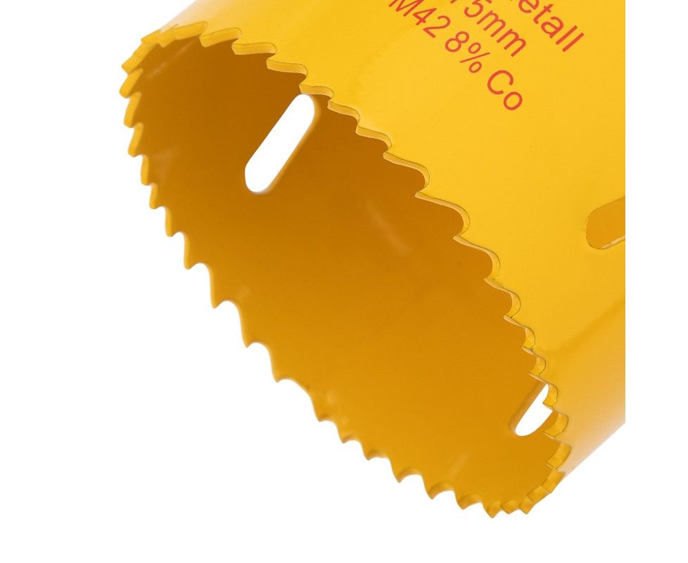 Конструкция оснащена специальным отверстием в боковой стенке, которое компенсирует деформации при перегреве, отводит строительную пыль и шлам. Особая заточка зубьев способствует эффективному входу в материал, что позволяет вырезать отверстия правильной круглой формы без сколов и трещин.