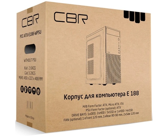 Корпус CBR E188 (PCC-ATX-E188-USB31-USB22-WPSU), ATX Miditower, без БП, 1*USB 3.0, 2*USB 2.0, HD Audio+Mic, Black
