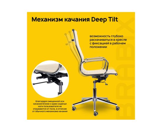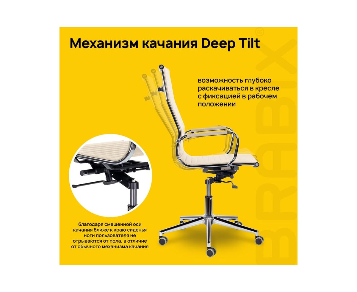 Механизм качания "Deep Tilt" - это возможность глубоко раскачиваться в кресле, а также фиксация в одном рабочем положении. А благодаря смещенной оси качания ближе к краю сиденья ноги пользователя не отрываются от пола в отличие от обычного механизма качания "Top Gun". Механизм "Deep Tilt" отличается от других своей прочностью, надежностью, а также плавностью хода.