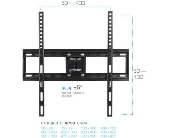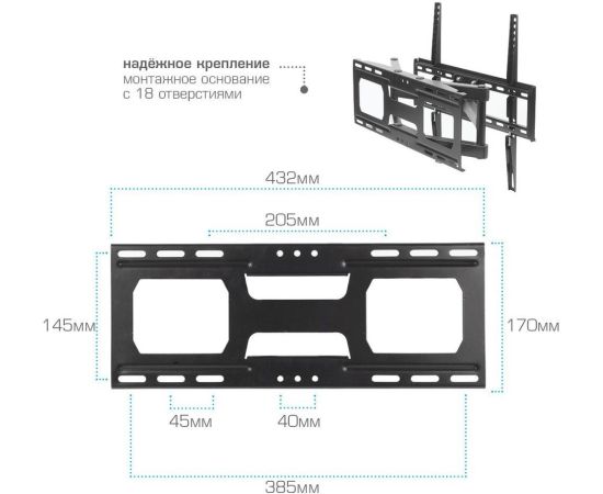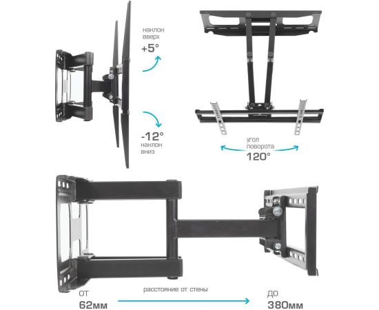 Особенности: Усиленная стальная конструкция, Универсальный-телевизор на кронштейне можно наклонить, повернуть и сдвинуть к стене, Широкая монтажная пластина обеспечивает надежное крепление ТВ на стену, Легкий монтаж телевизора, Корректировка экрана ±5°