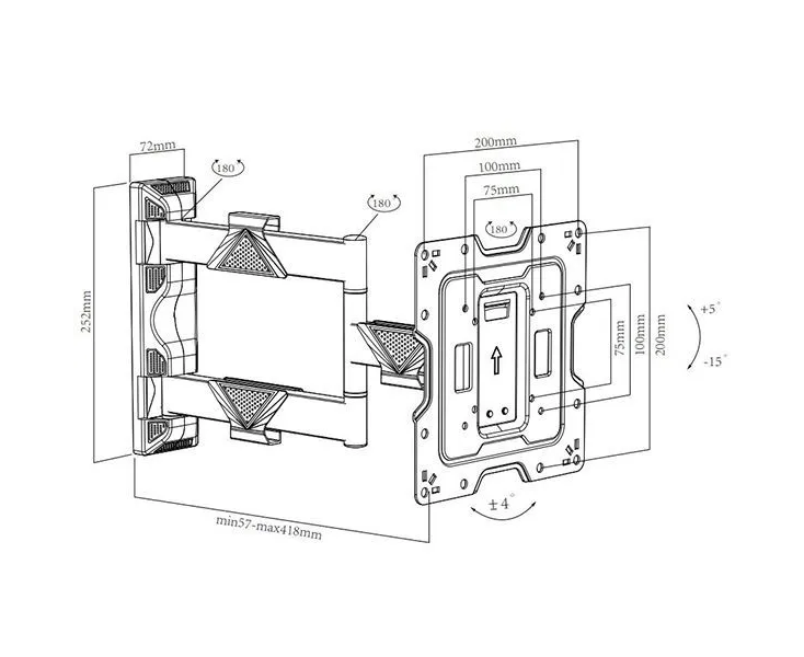 Даже учитывая широкие возможности движения, кронштейн крайне компактен в сложенном состоянии, благодаря продуманному механизму складывания; Система организации проводов – Кабель-канал позволяет зафиксировать провода для удобства и эстетической красоты; Возможность гибкой регулировки – Три надёжных осевых соединения обеспечивают возможность манёвренного поворота на угол до 180° и вылета от стены от 53 до 400 мм; Лёгкая регулировка наклона – Надёжная конструкция без особых усилий позволит осуществить наклон даже тяжёлого телевизора лёгким движением на угол до +10°.