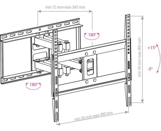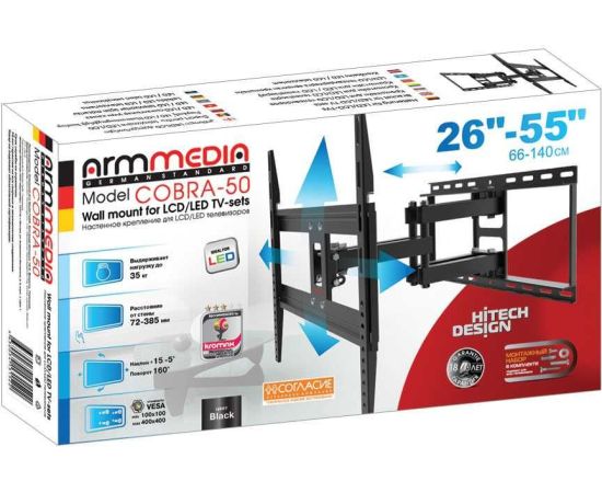 26"-65" Кронштейн Arm media COBRA-50 black Наклонно-поворотный max 35 кг. 4 ст св., нак. + 15° -5°, пов. 160°, от ст. 72-385 мм., max VESA 400x400