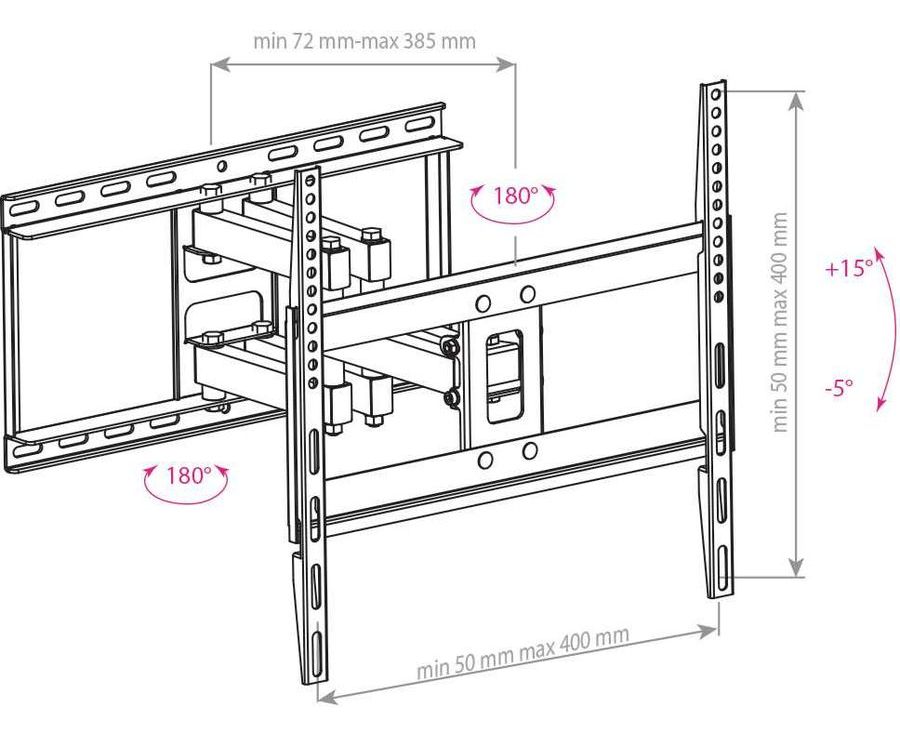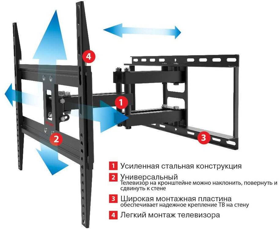 Описание Усиленная стальная конструкция. Универсальный — телевизор на кронштейне можно наклонить, повернуть и сдвинуть к стене. Широкая монтажная пластина обеспечивает надежное крепление ТВ на стену. Легкий монтаж.