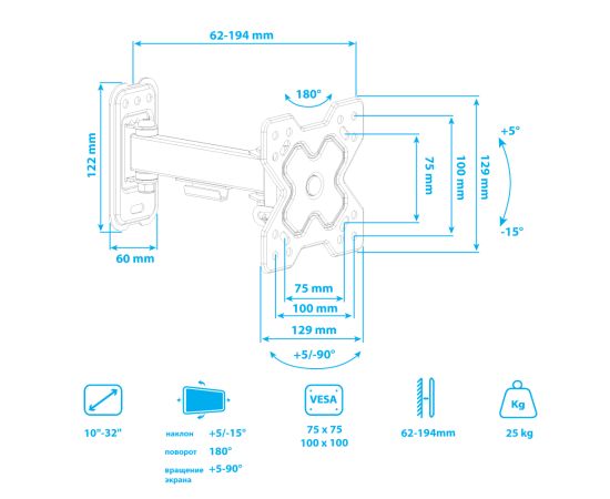 10"-32" Кронштейн Arm media MARS-5 black, max 25 кг, max VESA 100x100 мм