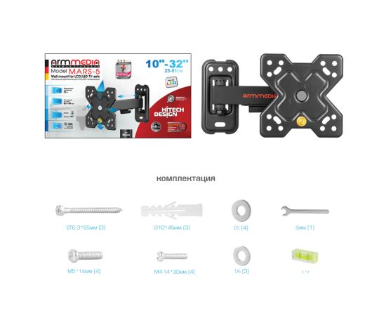 Кронштейн для телевизора, комплект ключей и крепежа для установки ТВ, навесной уровень, подробная инструкция на русском языке