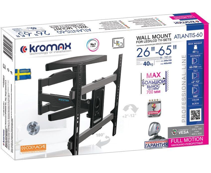 Кронштейн для телевизора Kromax ATLANTIS-60 черный 26"-65" до40кг поворотно-выдвижной и наклонный