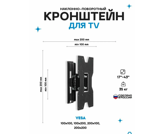 Изготовлен из стали холодного проката, выдерживает нагрузку до 35 кг. Функция наклона данной модели кронштейна позволит зафиксировать телевизор под углом.