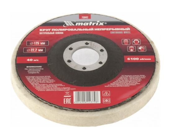 Непрерывный полировальный круг из натурального войлока Matrix 75942, 125 х 22,2 мм - оснастка для углошлифовальных машин, предназначенная для финишной отделки металлических, стальных, стеклянных, пластмассовых и других материалов. Круг эффективен при работе на плоских поверхностях и будет полезен на стройплощадке, в автосервисе, а также в домашней мастерской.