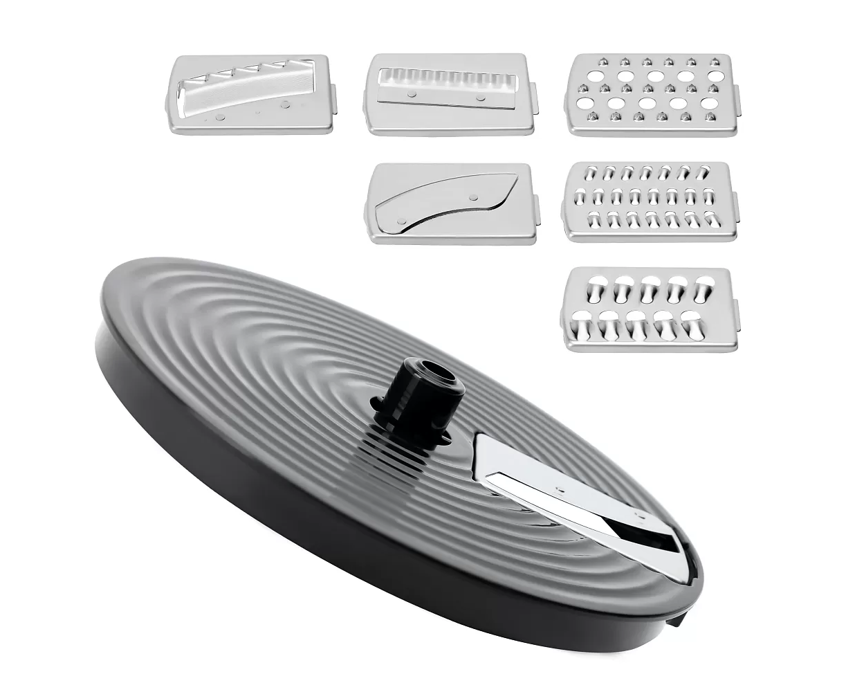 • Набор лезвий для нарезки – 7 шт (тёрка для драников, крупная тёрка, мелкая терка, волнообразное лезвие, для нарезки тонких ломтиков, для нарезки толстых ломтиков, для нарезки картофеля фри);