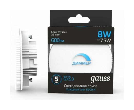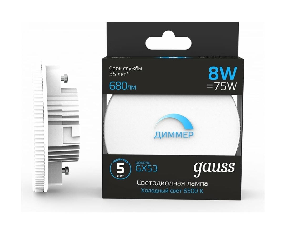 Лампа Gauss GX53 8W 680lm 6500K диммируемая LED 1/10/100 108408308-D - самое лучшее решение для натяжных, подвесных и реечных потолков. Лаконичный дизайн и элегантная простота отлично гармонируют с различными потолками. Малое энергопотребление, и хорошие технические характеристики.