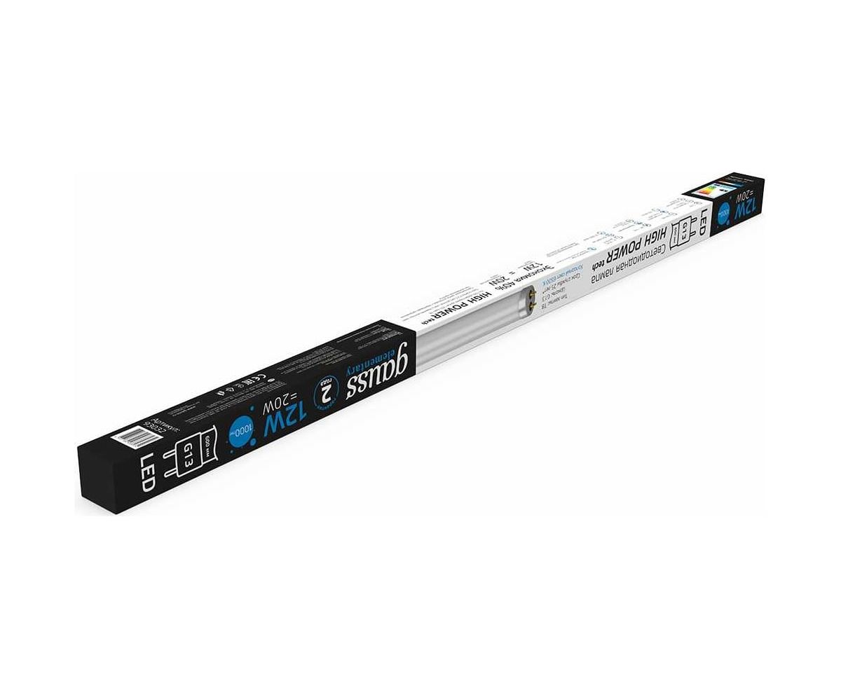 Лампа GAUSS Elementary T8, 12W, 1000lm, 6500K, G13, 600mm, стекло, LED, 1/20 93032 - выгодная замена стандартных люминесцентных ламп. Лампа имеет нормативную длину и без специальных доработок заменит люминесцентные лампы, поскольку устанавливается в стандартные светильники с патроном G13.