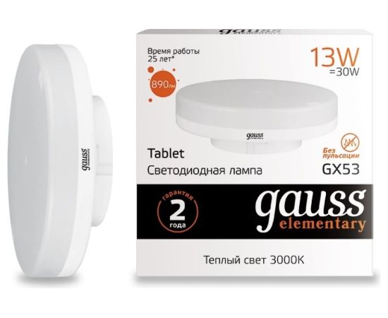Лампа светодиодная Gauss Elementary GX53 83813 13Вт цок.GX53 таблетка 220B 3000K св.свечения белый теплый уп/1шт