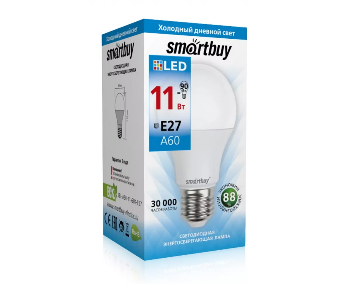 Лампа светодиодная SMARTBUY A60 11Вт 220V 6000K E27 (холодный свет) (1/10/100)