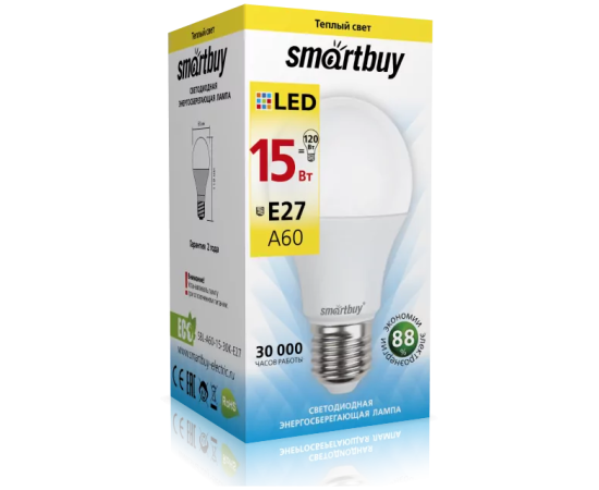 Лампа светодиодная SMARTBUY A60 15Вт 220V 3000K E27 (тёплый свет) (1/10/100)