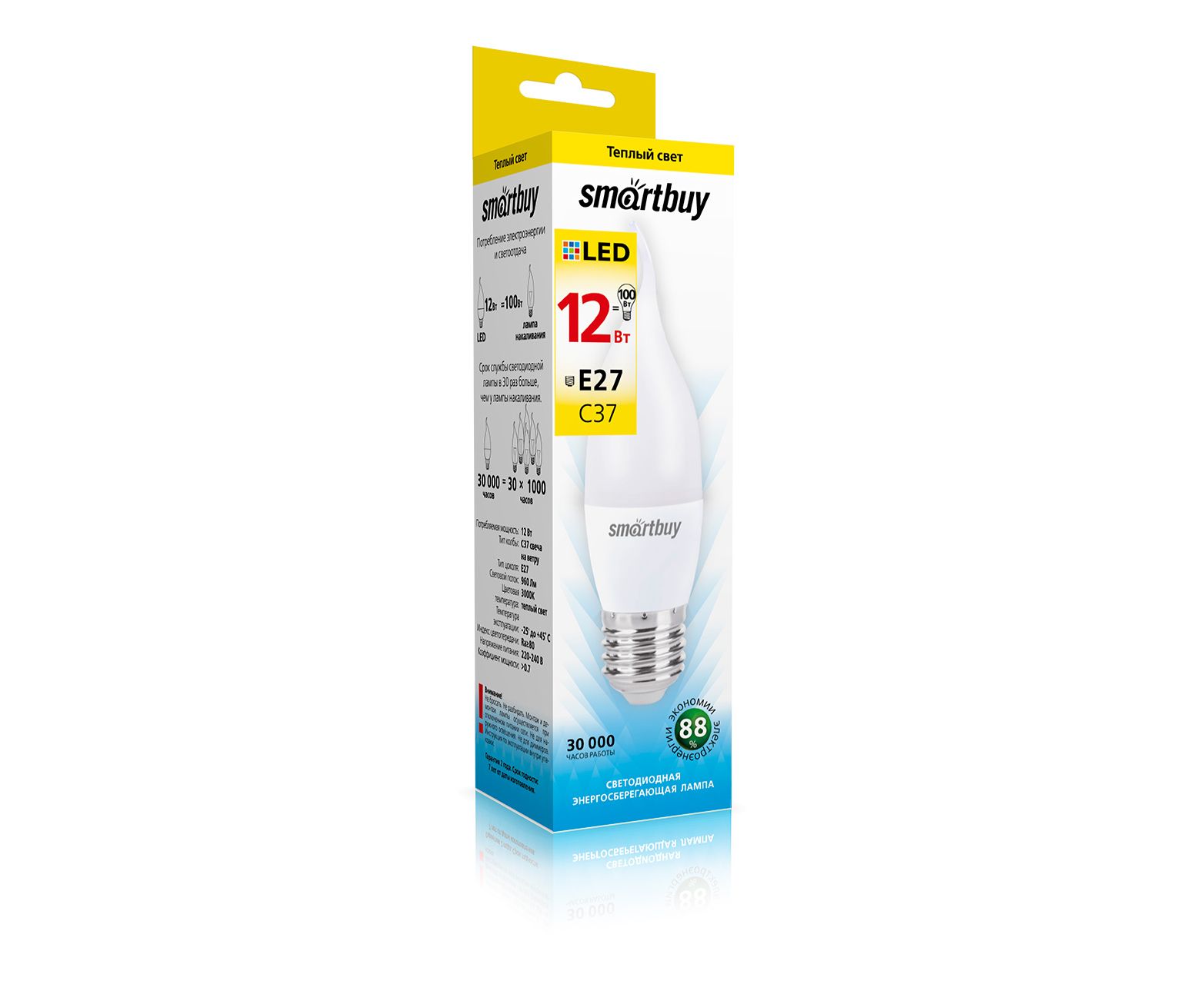 Лампа светодиодная SMARTBUY C37 12Вт 3000К E27 (свеча на ветру, матовая, теплый свет) (1/10/100)