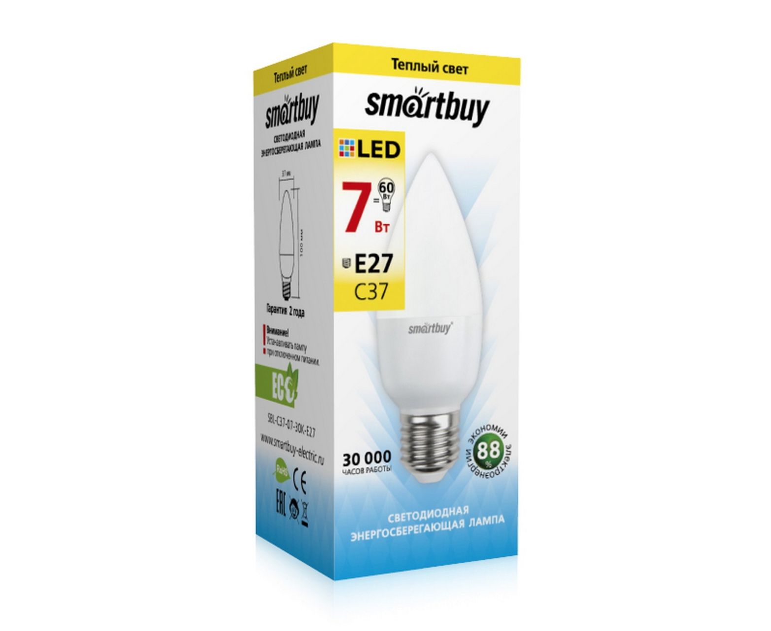Лампа светодиодная SMARTBUY C37 7Вт 220V 3000K E27 (свеча, теплый свет) (1/10/50)