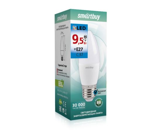 Лампа светодиодная SMARTBUY C37 9,5Вт 6000K E27 (свеча, холодный дневной свет)