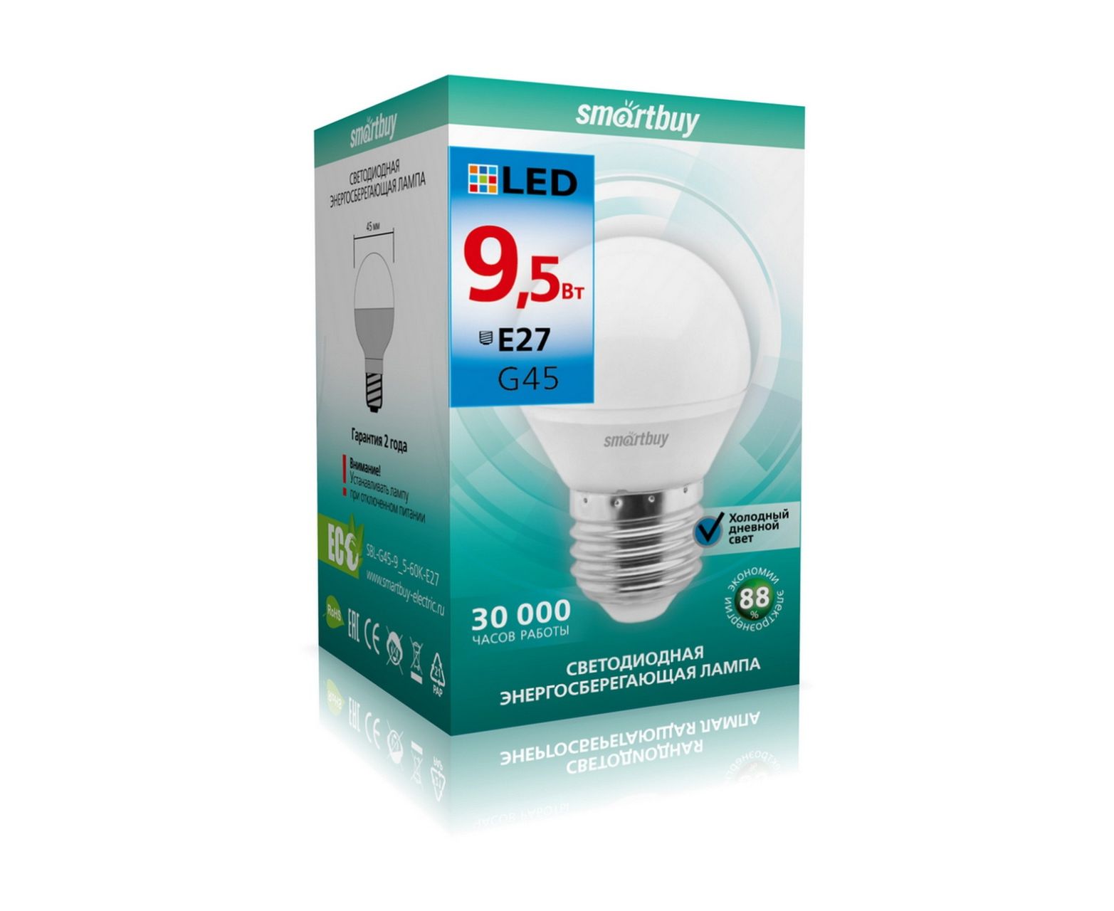 Лампа светодиодная SMARTBUY G45 9,5Вт 6000K E27 (глоб, холодный свет) (1/10)
