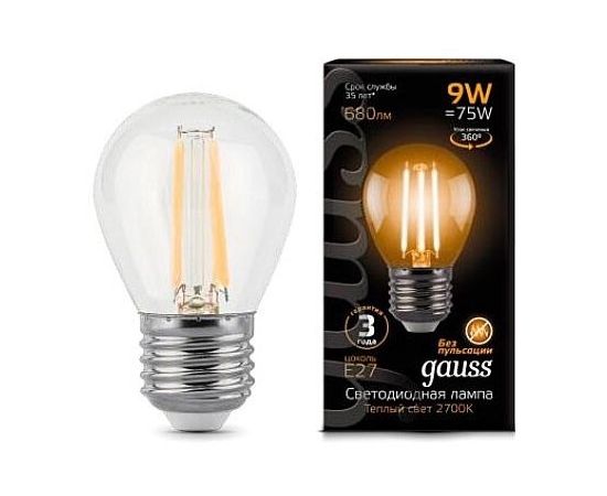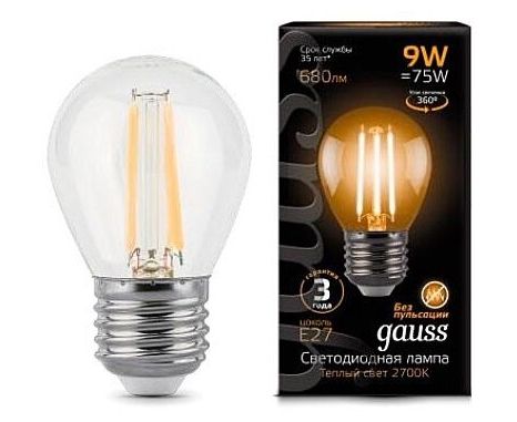 Лампочка Gauss 105802109 Filament Шар E27 9Вт 220B 2700K св.свеч.бел.теп. G45 (10шт)