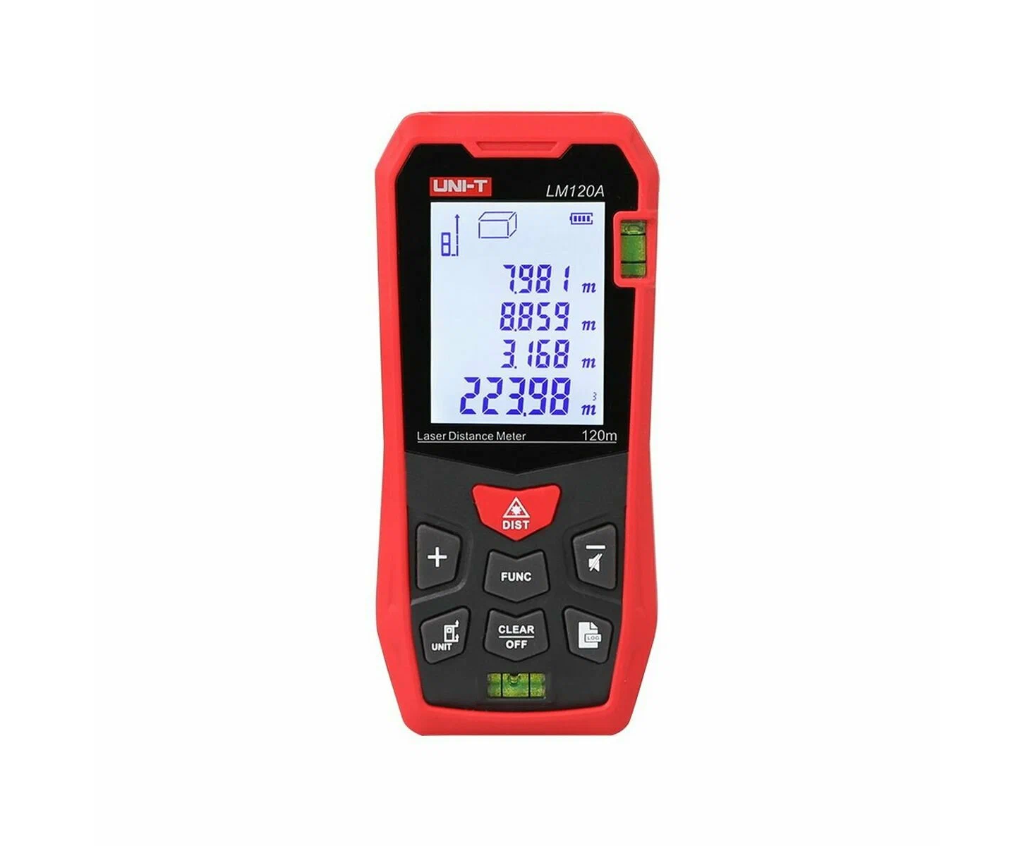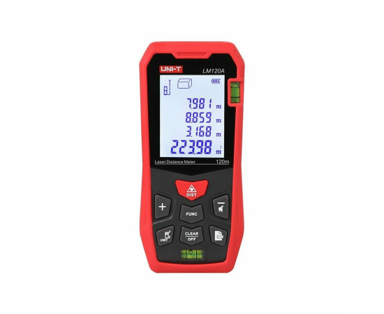 Лазерный дальномер UNI-T LM120A диапазон расстояний (120 м), тип дисплея (ЖК), единицы измерения (м/фут/дюйм), основа измерения (спереди/сзади),
