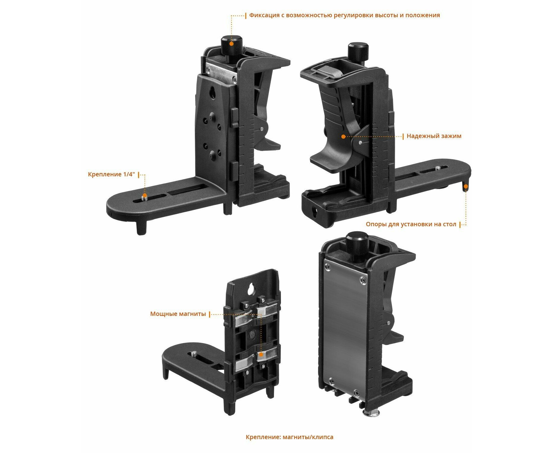 -Резьбовые крепления 1/4" и 5/8" для установки на штатив.
