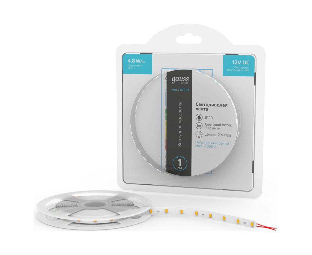 Лента Gauss Basic 12V 4,8W/m 312lm/m 4000K IP20 LED 2m BT001 способна решить ряд задач связанных как с декоративным освещением помещений, так и с экстерьерной подсветкой.