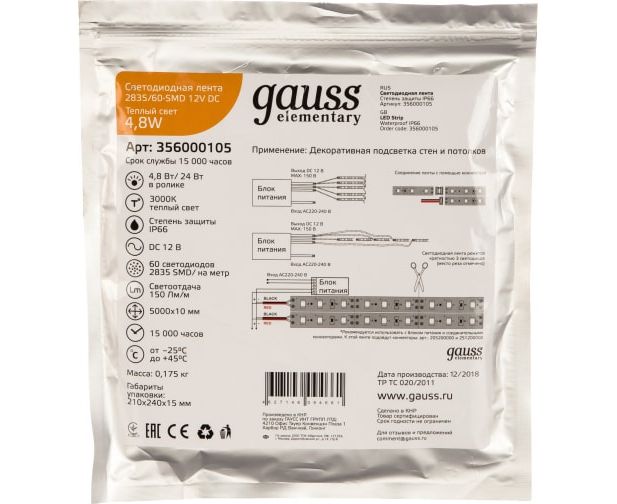 Технические характеристики Gauss LED Elementary 2835 60-SMD 4,8 Вт 12 В DC 5 м 356000105