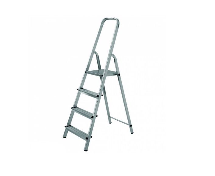 Легкая и устойчивая лестница стремянка имеет прочный каркас из алюминиевых труб квадратного сечения. Имеет 3 узких и одну широкую ступень-площадку, а также высокую ручку. Ножки стремянки оснащены пластиковыми, ребристыми, но не царапающими пол, накладками против скольжения. Все ступени имеют ребра противоскольжения.