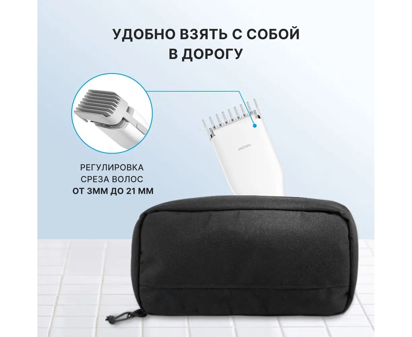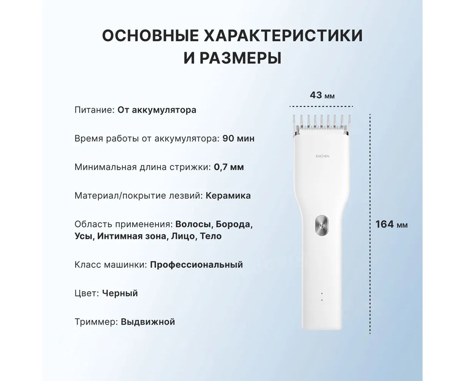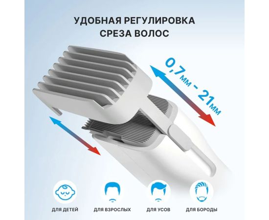 Машинка для стрижки волос оснащена нанокерамической головкой, на корпусе располагается кнопка управления и порт USB Type-C. Возможна регулировка желаемой длины прически от 0.7 до 21 мм.