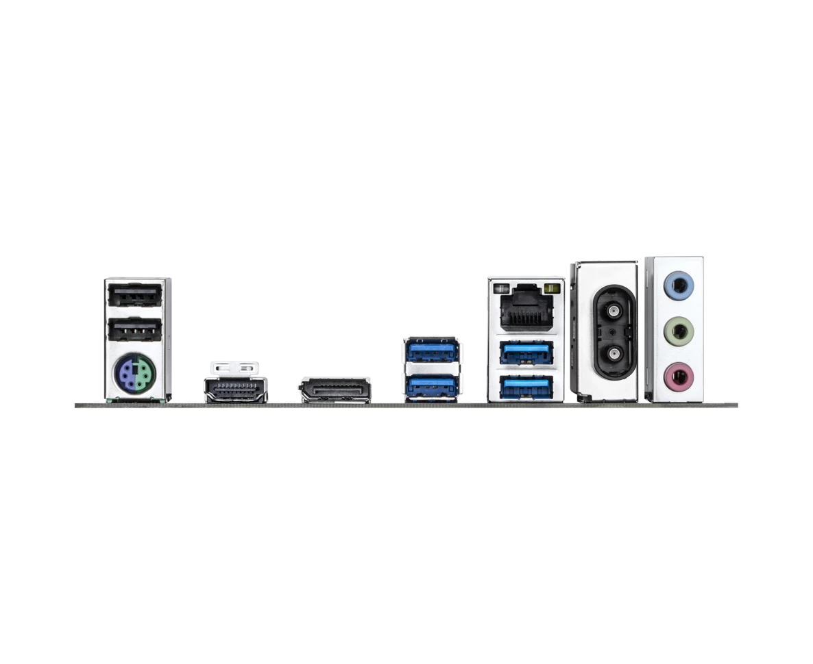 PS/2, 2 x USB 2.0, 4 x USB 3.2 Gen1, HDMI, DisplayPort, RJ-45