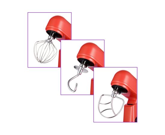 В комплекте идут венчик для взбивания, насадка для смешивания, крюк для замеса крутого теста, а также сепаратор для яиц и лопатка для ручного смешивания и вычищения остатков из чаши.