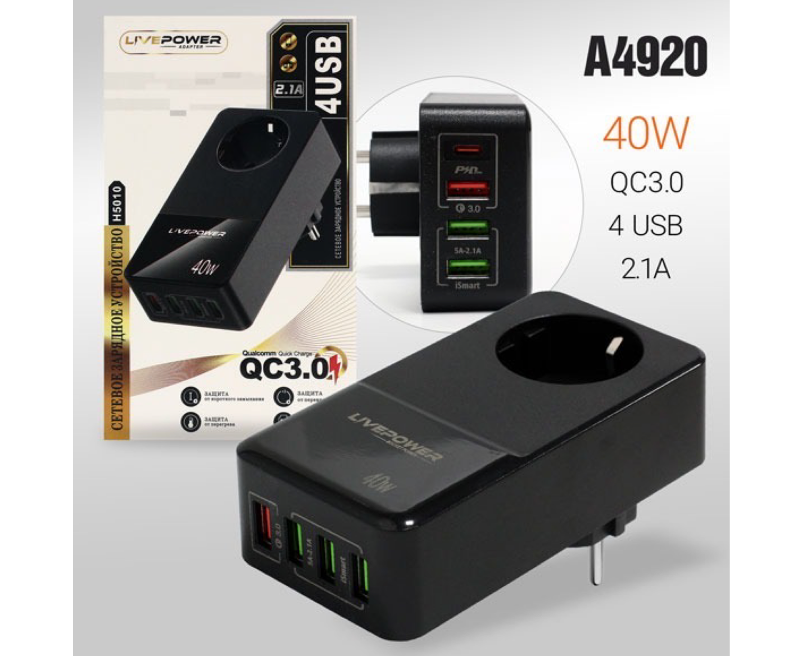 Многофункциональный сетевой адаптер Live-Power H5010 4USB порт QC3.0 + 1 гнездо для розетки