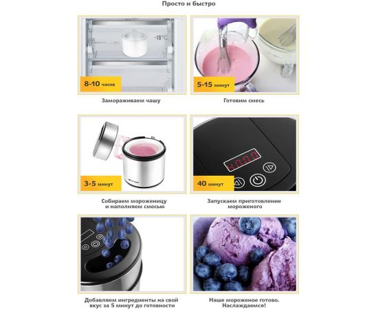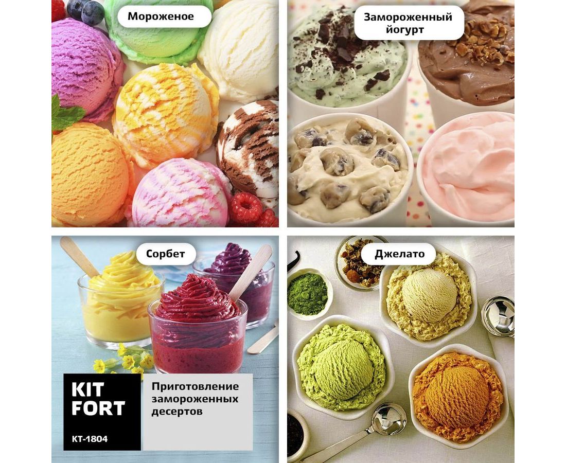 Полуавтоматическая мороженица Kitfort КТ-1804 поможет приготовить вам настоящее мороженое из натуральных продуктов, а также сорбет, джелато и замороженный йогурт. Мороженица имеет стильный металлический корпус, снабжена системой смешивания и имеет чашу заполненную хладагентом для охлаждения смеси.
