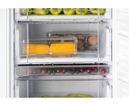 Морозильник имеет 8 секций для размещения продуктов: 6 выдвижных прозрачных ящиков и 1 отделение с откидной шторкой, лоток для ягод и форму для льда. Внутренняя поверхность модели имеет антибактериальное покрытие, которое предотвращает появление неприятных запахов и образование бактерий.