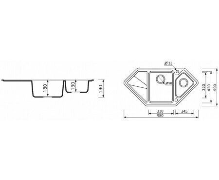 Мойка Marmorin Torro 220 613 012, гранит, чаша+1/2чаши+ сушка (trapez), 980х500х190, black Metalic