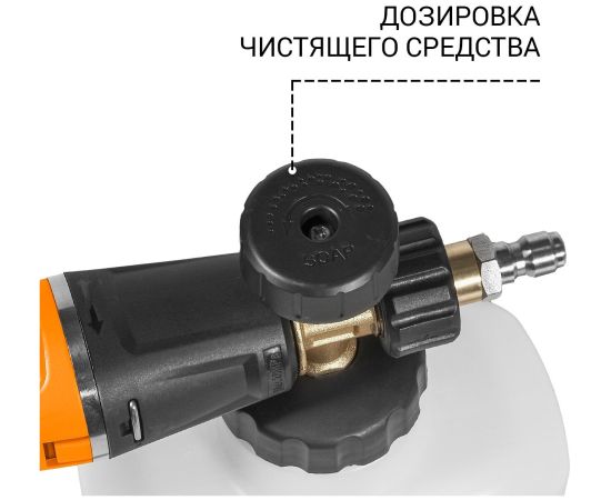 документация, игла чистящая, напорный шланг, пеногенератор, пистолет, сменные форсунки 4 шт, фильтр, шланг высокого давления
