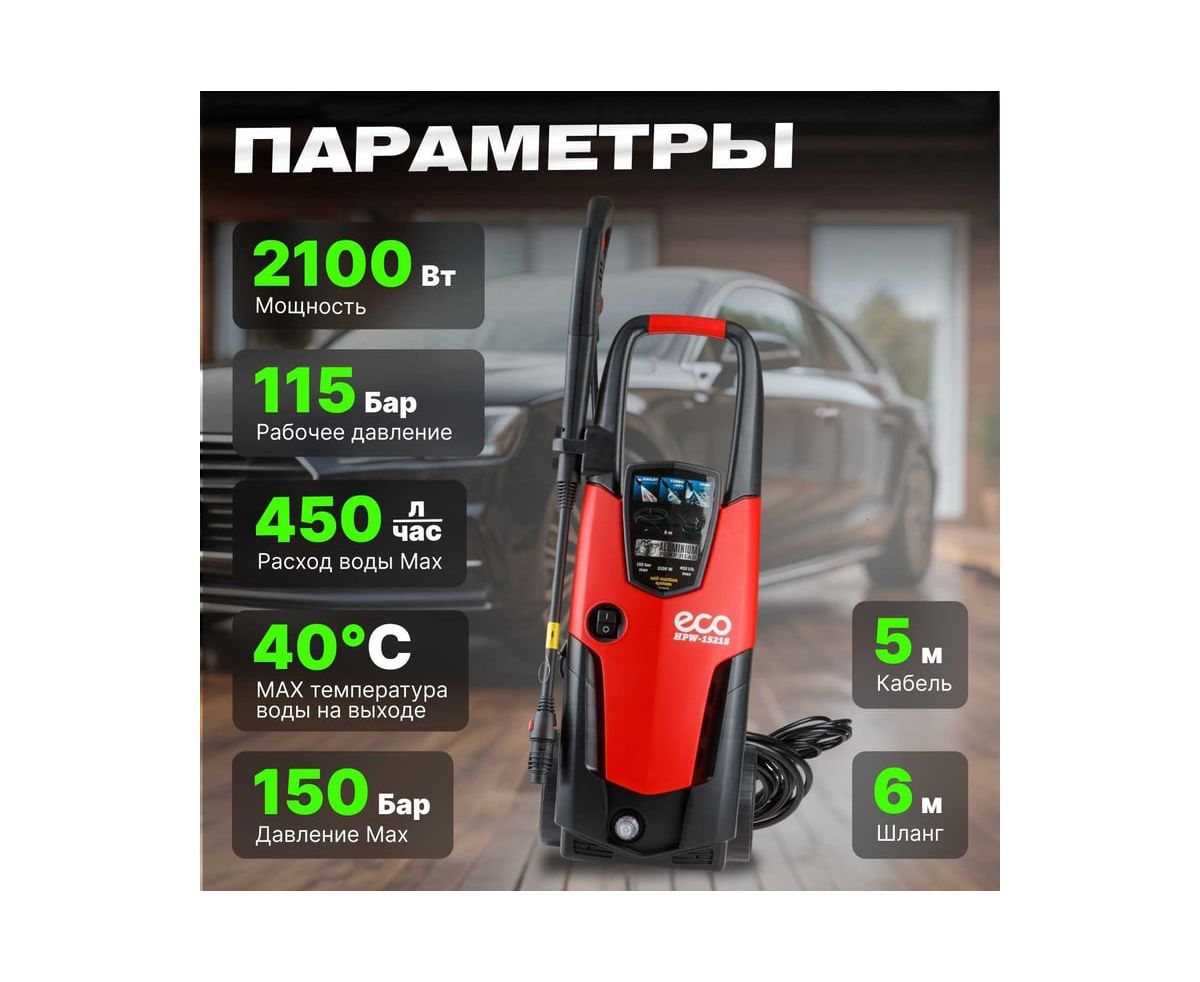 Мойка высокого давления ECO HPW1521S0001 применяется для очистки фасадов зданий, садовых дорожек и внедорожников.