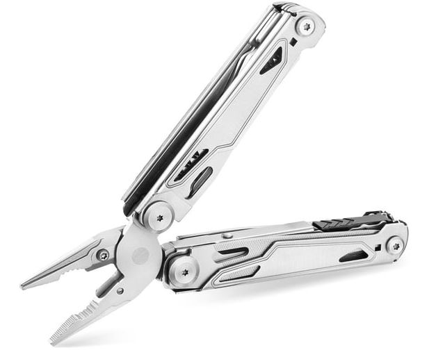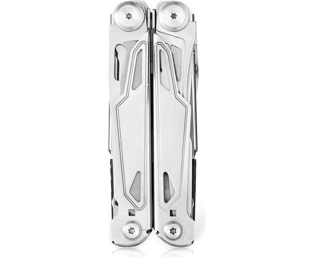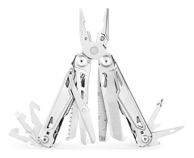 кусачки со сменными лезвиями, плоскогубцы, ножницы, пила, нож с прямым лезвием, сантиметровая линейка, шило, стропорез, отверстие для продевания нити, 2 плоские отвертки, крестовая отвертка, инструмент для зачистки проводов, открывалка для бутылок, открыв