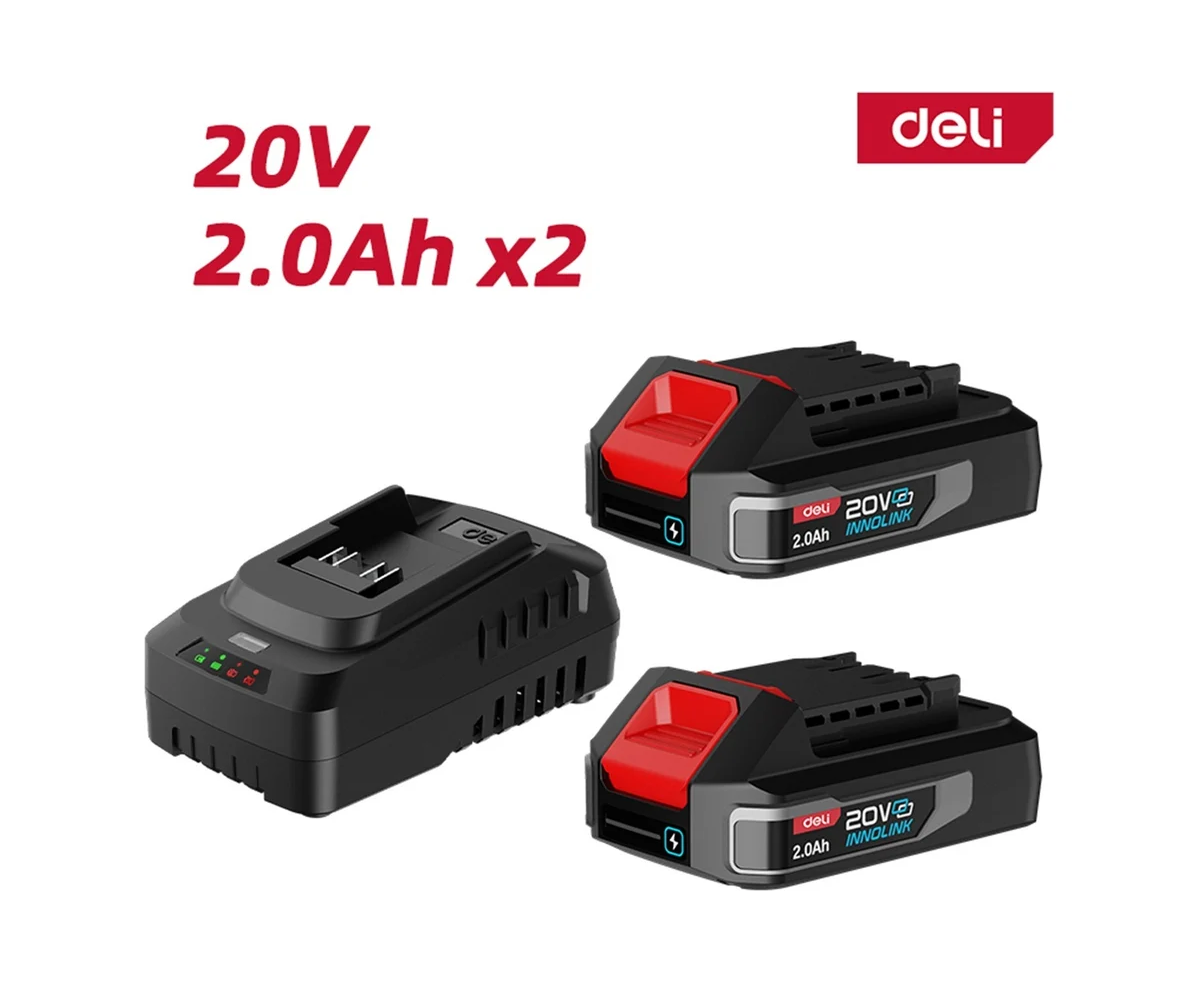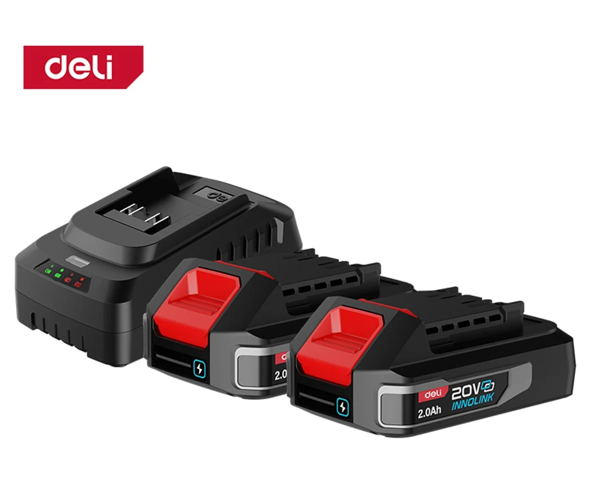 Комплект 2×20В 2Ач + зарядное устройство – идеальный старт для работы с инструментами системы Deli Innolink. Готов к использованию – один аккумулятор в работе, второй на подзарядке.