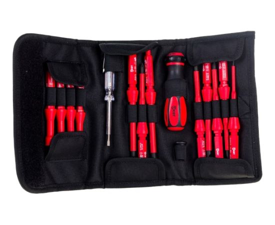 Набор диэлектрических отверток - комплект для электромонтажных работ, состоящий из эргономичной рукоятки и различных стержней с изоляцией. Комплектуется сумкой для переноски на поясе. На каждую отвертку нанесено обозначение типоразмера.