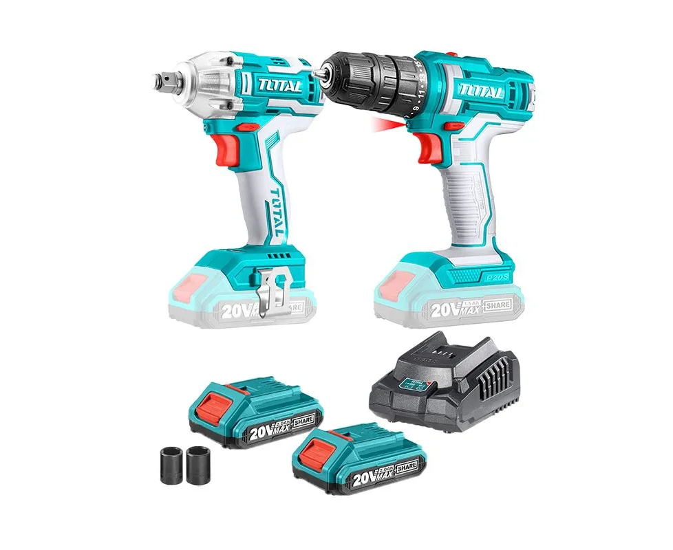 TOTAL TOSLI230702 – набор инструментов TOTAL P20S( с единым АКБ), включающих дрель-шуруповерт TDLI200528, гайковерт TIWLI2038, 2 АКБ, ЗУ и оснастку
