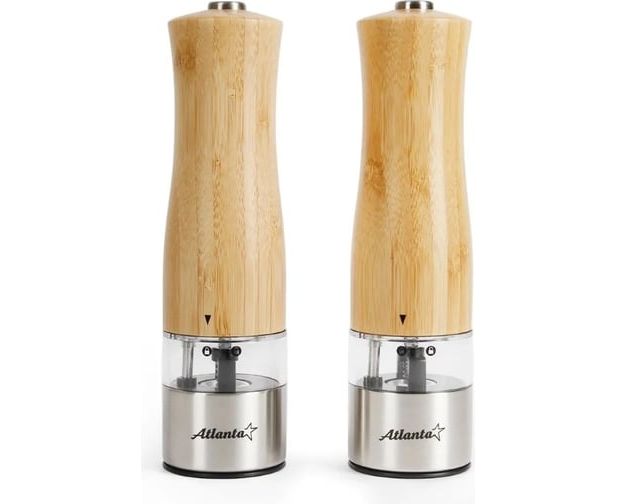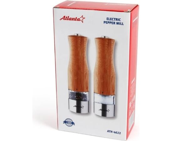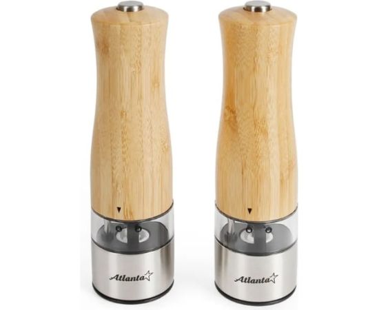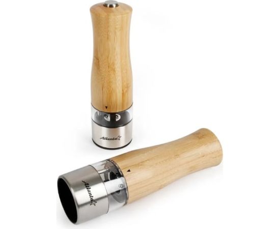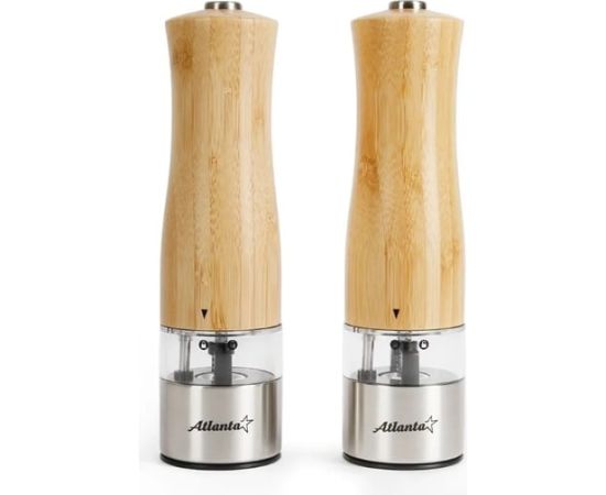 ATH-4622 (brown) Набор из двух электрических мельниц для специй Atlanta, работа от 6хААА батареек. Долговечный керамический механизм, корпус из экологичного материала - бамбука, нижняя часть выполнена из нержавеющей стали. Регулировка степени помола.