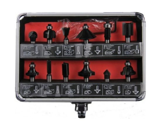 В набор входит 12 фрез разных по форме и назначению. Хвостовик 8 мм.