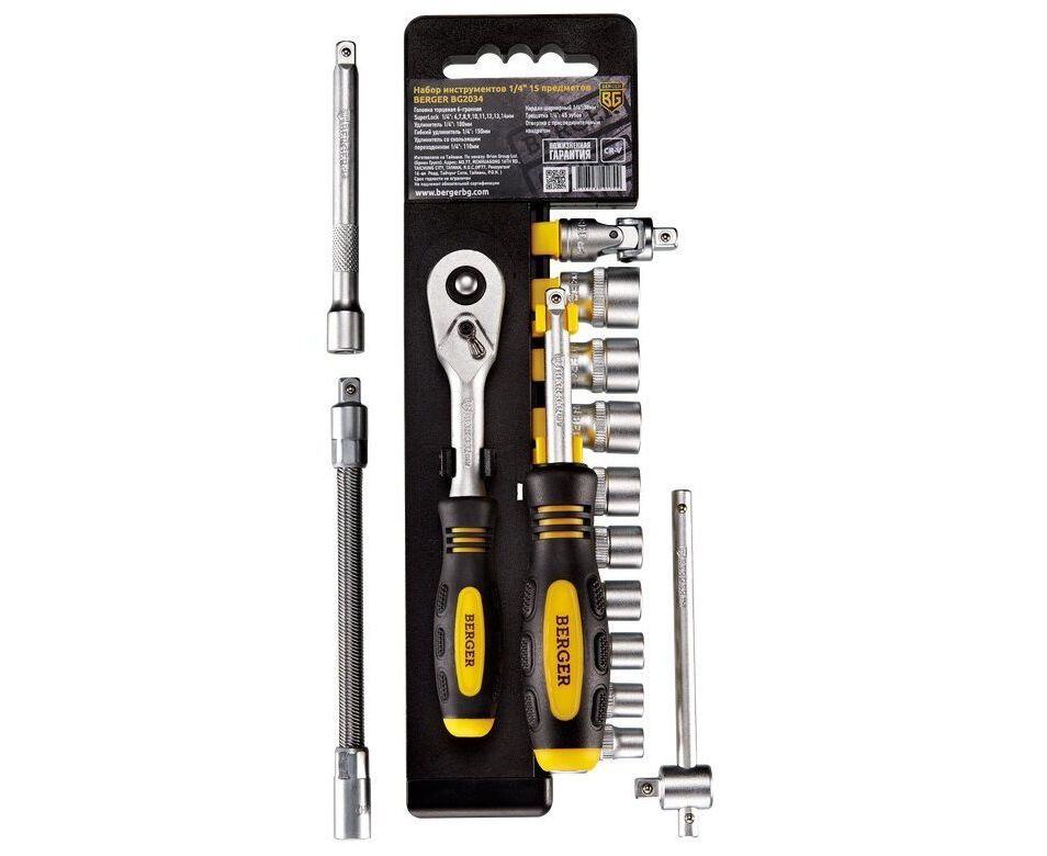 Набор головок торцевых BERGER BG2034 6-гранных SuperLock 1/4" (6-14 мм) и инструментов 1/4"