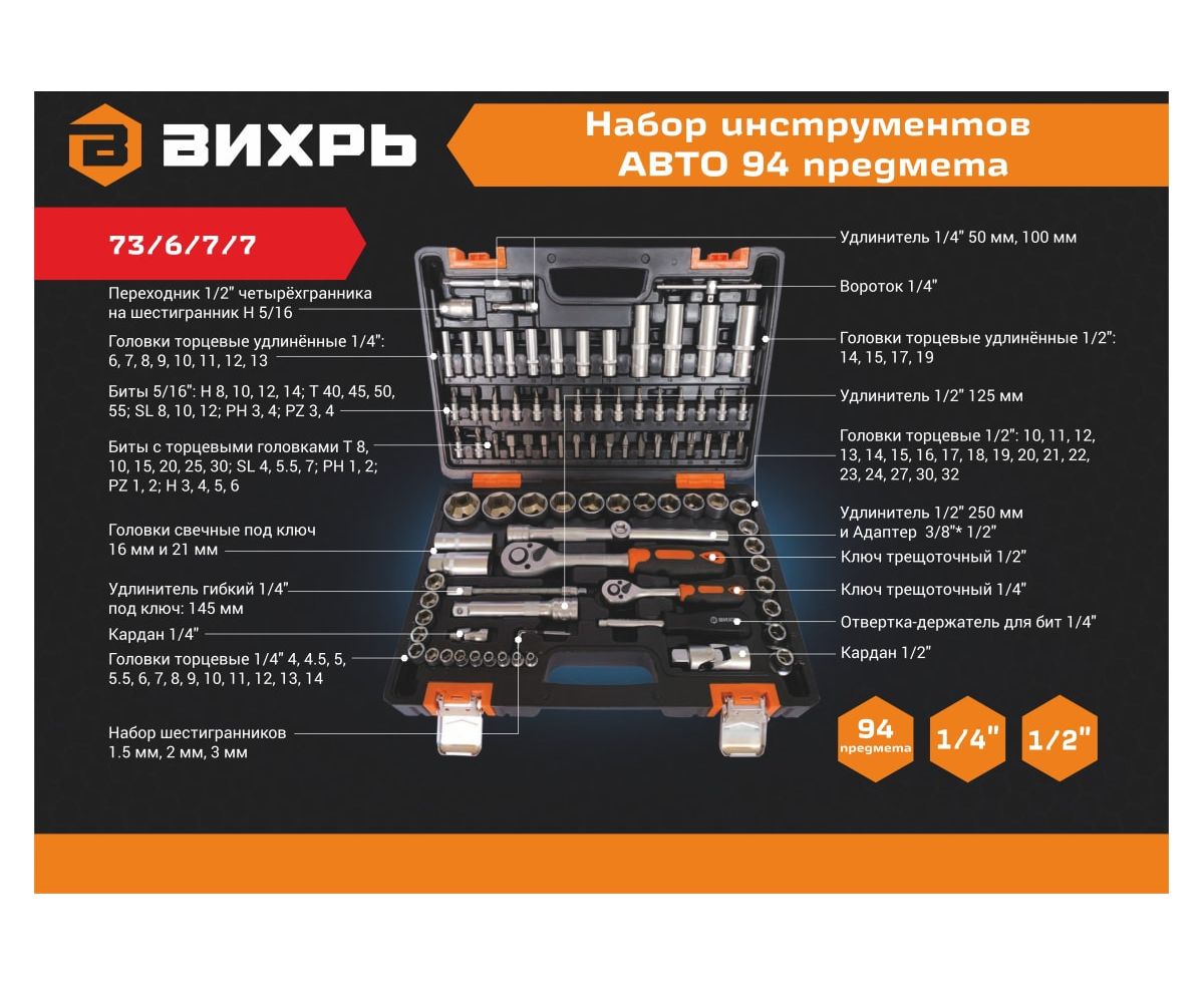 Набор инструментов Авто Вихрь 73/6/7/7 в кейсе/94 предмета