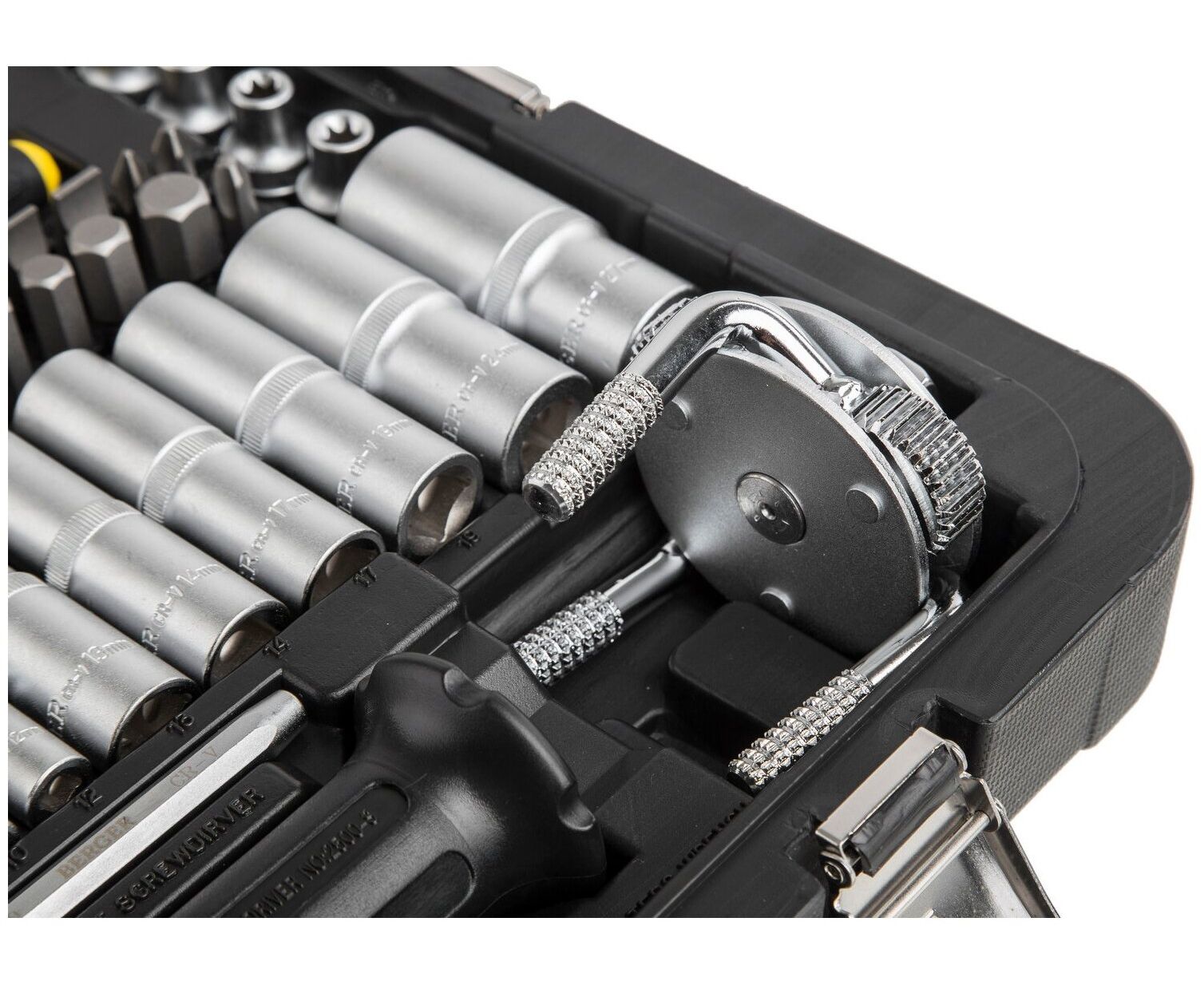 1/4" (Super Lock): 6, 7, 8, 9, 10, 11, 12 мм; длинные 1/4" (Super Lock): 8,10,12 мм; Torx 1/4": E4, E5, E6, E7, E8; трещетка 1/4": 45 зубов; вороток т-образный 1/4": 110 мм; удлинитель 1/4": 50, 100 мм; гибкий удлинитель 1/4": 150 мм; карданный шарнир 1/4"; 1/2" (Super Lock): 13, 14, 15, 16, 17, 18, 19, 20, 21, 22, 24, 25, 27, 30, 32 мм; длинные 1/2" (Super Lock): 13, 14, 17, 19, 24, 27 мм; Torx 1/2": Е10, Е11, Е12, Е14, Е16 Е18, Е20, Е22; свечные 1/2": 16, 21 мм; трещетка 1/2": 45 зубов; вороток с шарниром 1/2": 375 мм; удлинитель 1/2": 125, 250 мм; карданный шарнир 1/2"