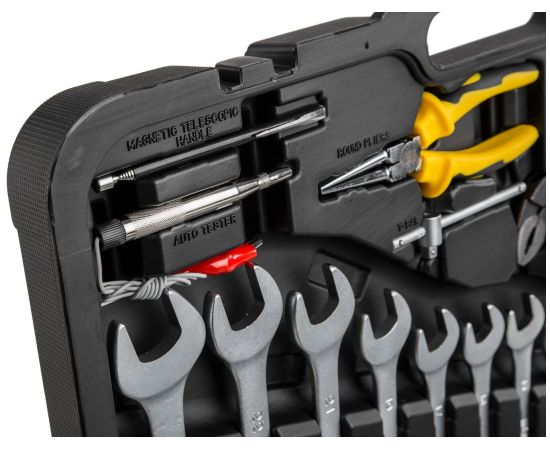 в комплекте: 1/4": трещотка (ключ трещоточный с быстрым сбросом) 45 зубов: 150 мм, вороток Т-образный: 110 мм, отвертка с присоединительным квадратом: 150 мм, удлинитель: 50, 75, 150 мм, удлинитель гибкий: 150 мм, кардан шарнирный, адаптер для бит; 1/2": трещотка (ключ трещоточный с быстрым сбросом) 45 зубов: 260 мм, вороток Т-образный с бегунком: 250 мм, вороток шарнирный: 375 мм, удлинитель: 50, 125, 250 мм, кардан шарнирный, переходник скользящий для удлинителей; 5/16": адаптер для бит; ручка магнитная телескопическая: 125-630 мм, автотестер 6-12-24 V; тип стали инструмента: CR-V (хром-ванадий); материал ручек инструмента: резинопластик; тип стали бит: S2