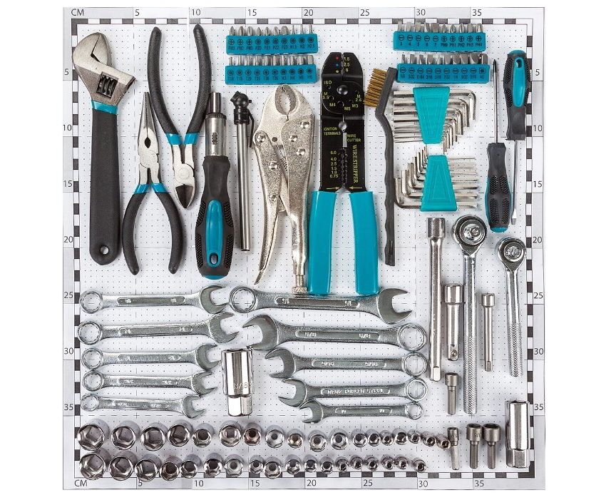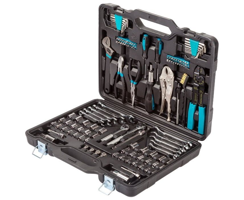 Описание: Ключи, кусачки изготовлены из крепкой кованой стали. Биты (Cr-V) из хром-ванадиевой стали. В наборе есть ручная струбцина (пинцы), ей легко бысторо фиксируются небольшие детали. Клещи электрика позволяют резать провода и снимать с них изоляцию. Латунной щеткой удобно чистить клеммы и контакты.
