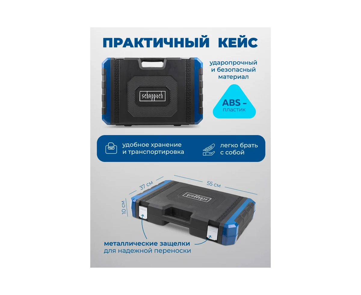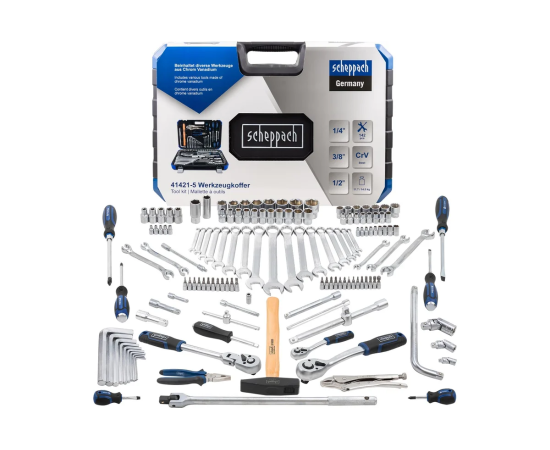 Универсальный набор инструментов для автомобиля от немецкого бренда Scheppach, состоящий из 142 предметов, оптимально подходит для использования на СТО, в мастерских, на производстве, в гараже, на даче и дома.